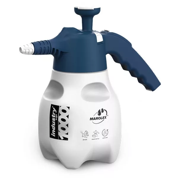 Marolex EPDM Industry 1000 lúgos karakterű folyadékok kijuttatására. Kisebb ipari munkák elvégzésére ajánlott termék (pl. autómosókban felnitisztítás, motortér takarítás, élelmiszeriparban kisebb felületek fertőtlenítése). Flexibilis felszívócsövének köszönhetően 360 fokban működőképes, ezáltal bármilyen pozícióban (akár fejjel lefelé fordítva is!) használhatjuk, tartályából az utolsó cseppet is kipermetezhetjük. Kifejezetten ergonomikus kialakítású (hüvelykujjal könnyedén rögzíthető áramlás-retesz, süllyesztett felületek a tartály nyakán a könnyebb fogás érdekében, egy ujjal működtethető biztonsági szelep).